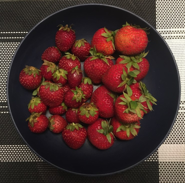 Nonetheless, I persisted in seeing the strawberry experiment through.  I bought two pounds of Driscoll’s berries and a package of the sluggish flowers to approximate the nasturtiums. Since Whole Foods didn’t have any basil, I drove twenty minutes to a Vietnamese market.  So, even though my first purchase was eco-friendly, I increased my carbon footprint in the name of science.